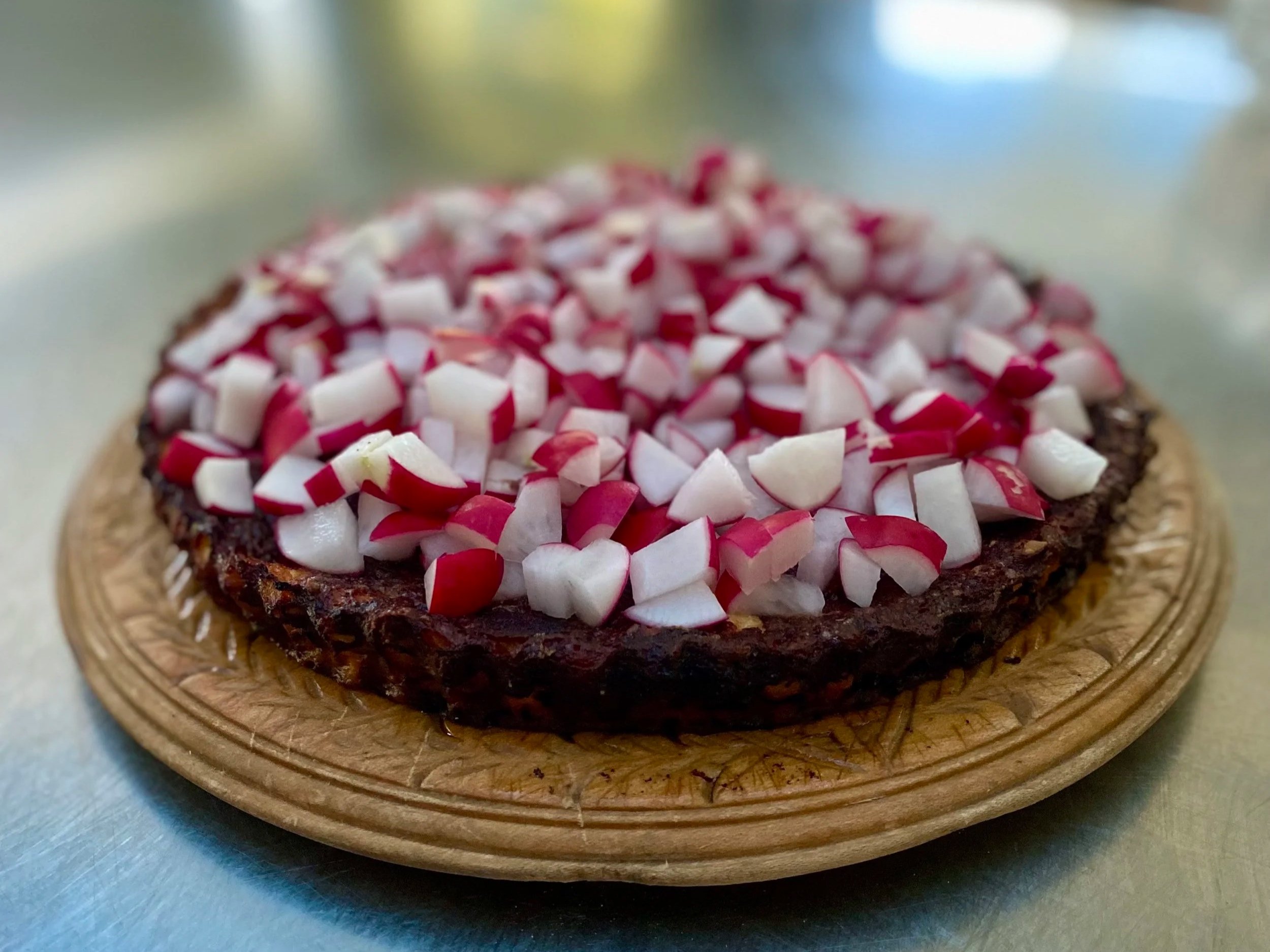 Hakk reddikene i små biter og fordel over terten rett før servering.