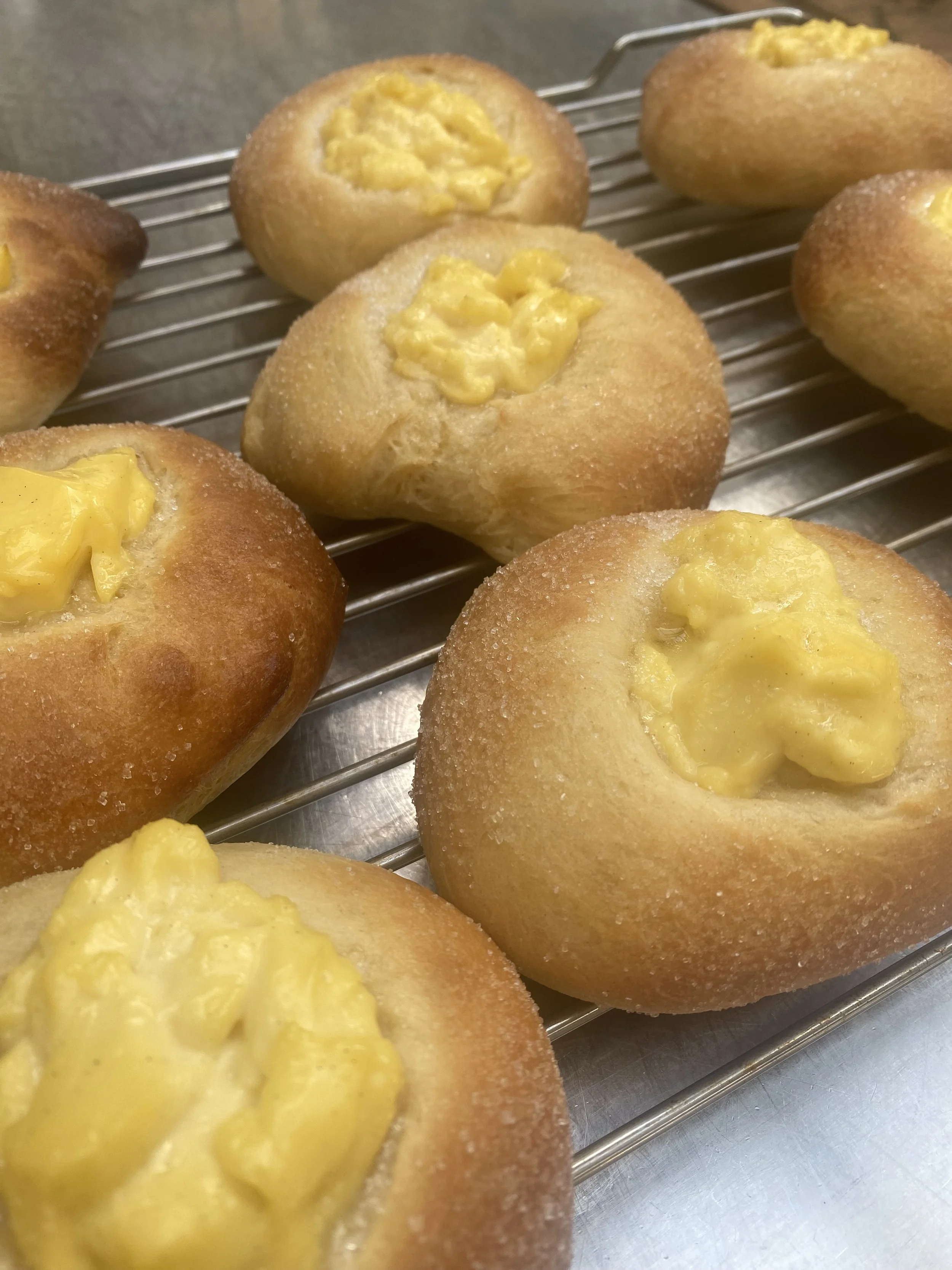 Ha vaniljekremen i en sprøytepose eller bruk en skje. Lag kratere i midten av bollen og sprøyt i vaniljekrem.