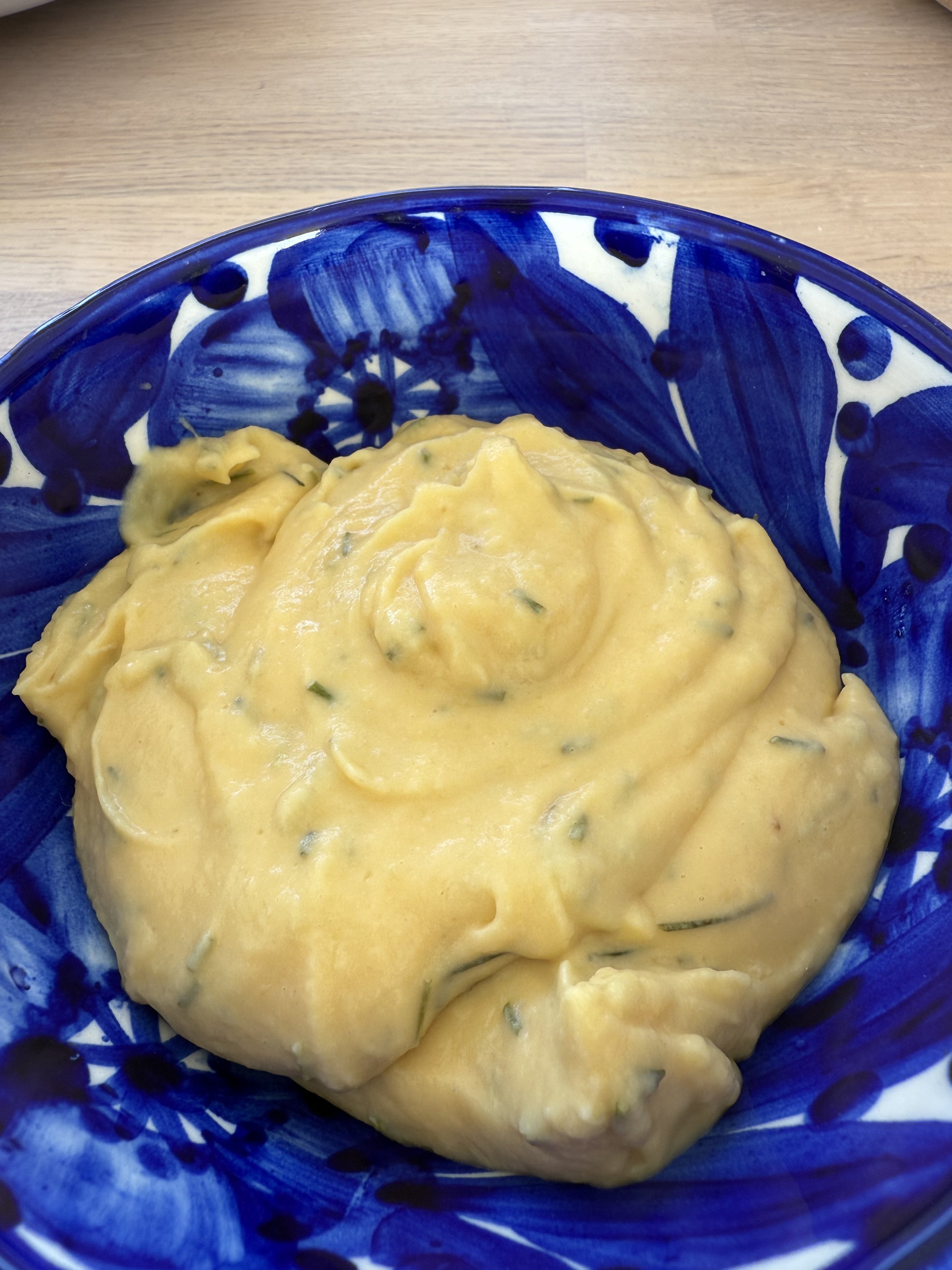 Eggeplommene, røres inn i fersken massen på svak varme til den tykner litt. Ha i smør litt av gangen. Ha i hakket gressløk til slutt