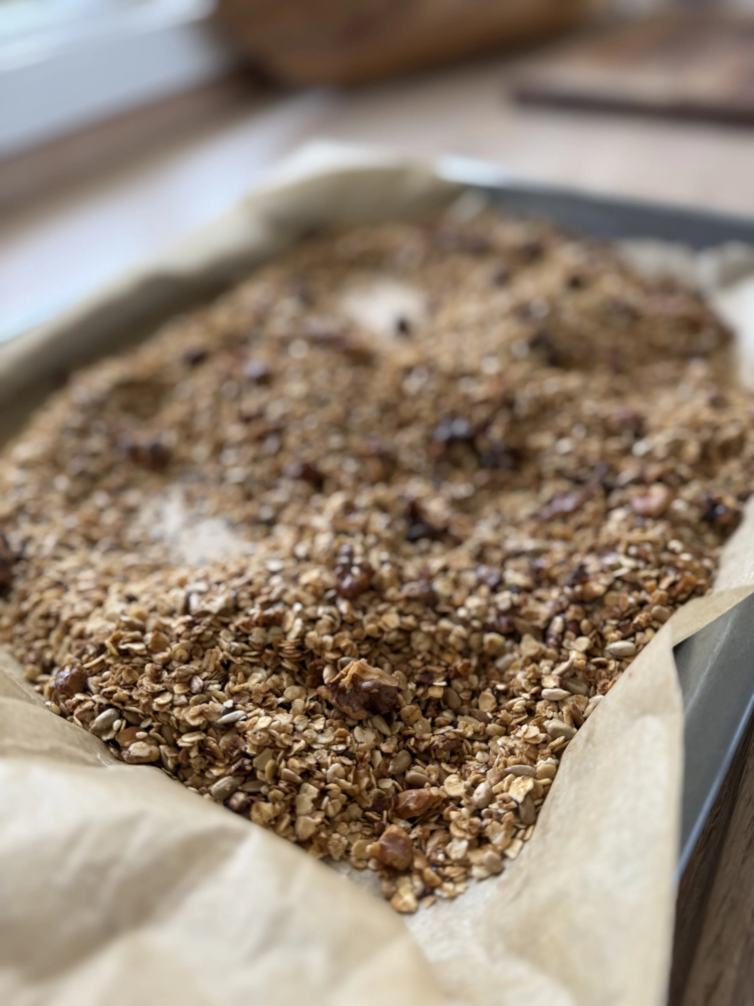 Ha alle ingrediensene på et stekebrett med bakepapir. Bland sammen godt slik at alt blir dekket med olje. Jeg liker at granolaen er litt godt stekt, på slutten av 50 minutter setter jeg opp temperaturen til 200 grader og lar den steke litt til. Følg med så den ikke blir brent.